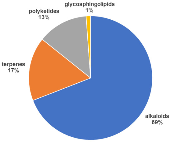 The compounds isolated from marine sponges presented in the articles analyzed with antiplasmodial effect belong to alkaloids, terpenes and polyketides class of secondary metabolites. Most of the compounds with potential activity against Plasmodium sp. are alkaloids (69% of 259), followed by terpenoids (17%) and polyketides endoperoxides (13%) (Figure 3). There are also reports of glycosphingolipids (GSL) from sponges able to inhibit the malaria parasite as well. The structures with their potency are described, and some of them present the known mechanism of action, which are discussed below.