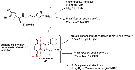 Figure 4. Alkaloids from marine sponges with antimalarial effect revealed moderate inhibitory activity on P. falciparum protein kinases (PfPK5 and Pfnek-1) and P. falciparum enoyl-ACP reductase (PfFabI).