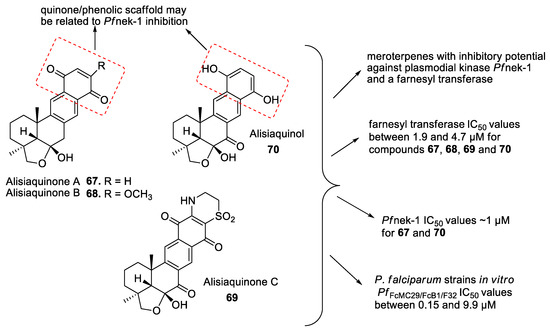 Meroterpenes (6770) from a new Caledonian sponge with antiplasmodial effect showed inhibitory potential against plasmodial kinase Pfnek-1 and a farnesyl transferase (Figure 5) [49]. As we described in the section above, xestoquinone (43), a quinone alkaloid from Xestospongia sp., is also a protein kinase inhibitor (PfPK5 and Pfnek-1), and it was suggested by Desoubzdanne and colleagues [49] that quinone/phenolic scaffold in the meroterpenes may be related to Pfnek-1 inhibition [50].