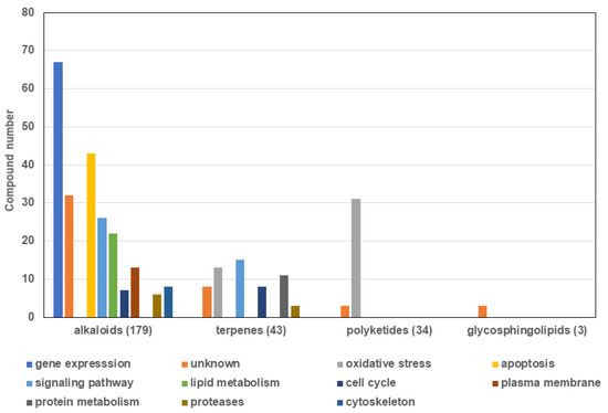 The second representative group is terpenes (43), which possess action related to oxidative stress and signaling pathways (30–34%) [49,50,83,84], as reported in normal and cancer cells lines, where ROS production was increased after a norterpene endoperoxide compound treatment [85]. A third group corresponds with the polyketides compounds (34), which have been shown to interact with Fe(II)heme, compromising the cell survival [86].