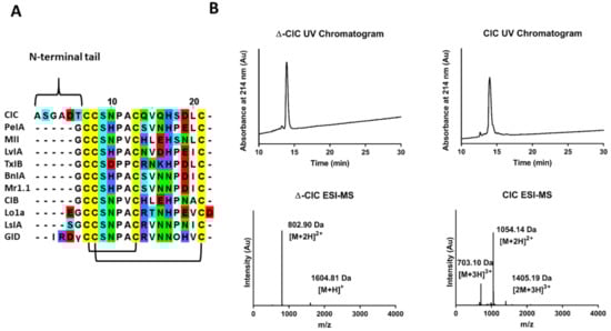 CIC alignment, UV chromatograms and ESI–MS analyses of synthetic peptides. (A). Alignment of CIC conotoxin with others closely related 4/7 α-conotoxins. The γ symbol indicates a carboxyglutamate residue, and O as a capital letter indicates a hydroxyproline residue. GID and CIC conotoxins are the only ones to display an N-terminal tail comprising more than two residues. The globular disulfide connectivity Cys I-III, Cys II-IV is represented. (B). RP-HPLC/ESI–MS analyses of synthetic ∆-CIC and CIC. ACN gradient was from 0 to 30% over 30 min. Reported mass values correspond to the average masses.