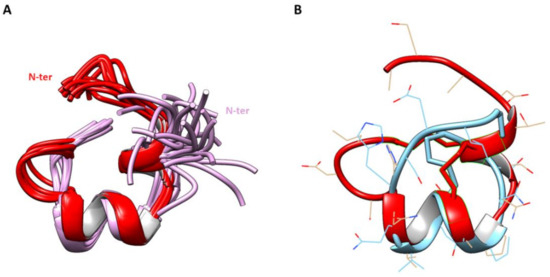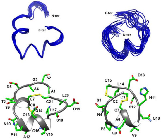 NMR spectra were acquired using a Bruker 600 MHz AVANCE III NMR spectrometer (Bruker, Karlsruhe, Germany) equipped with a cryoprobe. Lyophilized synthetic peptides (~1.5–2 mg) were dissolved in 90% H2O/10% D2O, and 2D 1H-1H TOCSY, 1H-1H NOESY, 1H-1H DQF-COSY, 1H-15N HSQC, and 1H-13C HSQC spectra were recorded using standard Bruker pulse sequences with excitation sculpting for solvent suppression. All spectra were acquired at 290 K with an interscan delay of 1 s. A mixing time of 200–250 ms was used when acquiring NOESY spectra, and isotropic mixing periods of 80 ms for TOCSY spectra. Spectra were processed using Topspin v3.6.1 (Bruker, Billerica, MA, USA) and assigned manually in CcpNmr V2 [22]. An ensemble of structures was calculated using CYANA [23] including torsion-angle restraints generated by TALOS+ [24]. Final structures were visualized using MOLMOL [25] PyMol (The PyMOL Molecular Graphics System, Version 2.0 Schroödinger, LLC., New York, NY, USA) and UCSF Chimera 4.1 [26].