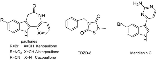 Chemical structures of the representative small-molecule glycogen synthase kinase 3β (GSK-3β) inhibitors.