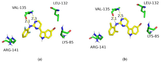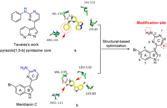 It has been reported that the 2-aminopyrimidine-substituted pyrazolo[1,5-b] pyridazine compound (Figure 2), developed by Tavares’s group, possesses excellent inhibitory activity against GSK-3β [11]. Consistent with the previous publication [11], the predicted binding mode of the compound with GSK-3β was reproduced as shown in Figure 2a. Similarly, we generated the docking model of meridianin C with the ATP-binding site of GSK-3β (Figure 2b). The NH and the adjacent nitrogen in the pyrimidine ring of these two compounds (highlighted in blue) have similar hydrogen-bonding interactions with the Val135 of GSK-3β. The aniline of the pyrazolo[1,5-b] pyridazine is located in the front solvent-exposed binding site, which has not been occupied in the meridianin C model. In addition, the back pocket formed by the residue Leu132 appears to be another pocket for optimization.