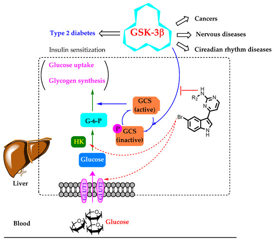 Regulatory control of glycogen synthase (GCS), the final enzyme in glycogen biosynthesis, is an obvious target for antihyperglycemic control. Overexpression/overactivation of GSK-3β can inhibit the activation of GCS effectively, and pharmacological inhibitors of GSK-3β have been demonstrated to activate glycogen synthase and improve glycogen synthesis, suppress gluconeogenesis, and increase glucose uptake (Figure 3) [12,14,15].