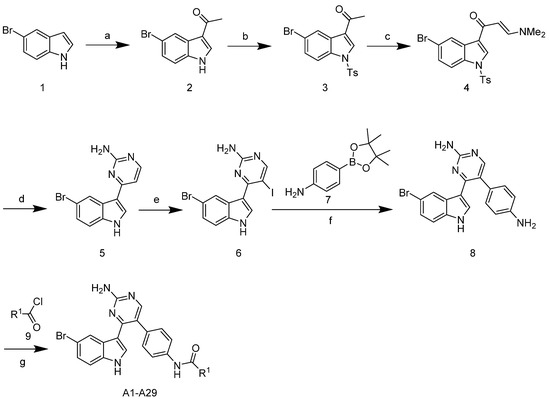 The synthetic route of the target compounds A1–29 is shown in Scheme 1. The commercially available starting material 5-bromoindole 1 was acetylated using acetyl chloride and SnCl4 in toluene to give the intermediate 2. Then, protection of indole was performed by reaction with tosyl chloride (TsCl) in the presence of 4-(dimethylamino)-pyridine (DMAP) and N,N-diisopropylethylamine (DIPEA) in methylene chloride, leading to the formation of compound 3. The reaction of compound 3 with N,N-dimethylformamide diethyl acetal (DMF-DMA) in N,N-dimethylformamide (DMF) provided enaminone 4 in a 52% yield. Treatment of enaminone 4 with guanidine hydrochloride in 2-methoxyethanol and potassium carbonate led to the formation of meridianin C 5 in a 51% yield. Meridianin C 5 was then iodinated with N-iodosuccinimide (NIS) in methylene chloride to give the corresponding compound 6 in an 87% yield. Suzuki cross coupling was then performed using boronate, a (1,1′-bis (diphenylphosphino) ferrocene) dichloropalladium (II) complex with dichloromethane, and sodium carbonate in an H2O/DME medium, which led to compound 8 in a 43% isolated yield. The target compounds A1–29 were obtained from the reaction of compound 8 with commercially available substituted acyl halides.