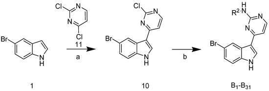 The synthetic route of the target compounds B1–31 is shown in Scheme 2. Compound 10 was obtained in a 63% yield using 5-bromoindole 1 and 2,4-dichloropyrimidine 11. Target compounds B1–31 were obtained from the reaction of 10 with commercially available substituted aromatic amines.