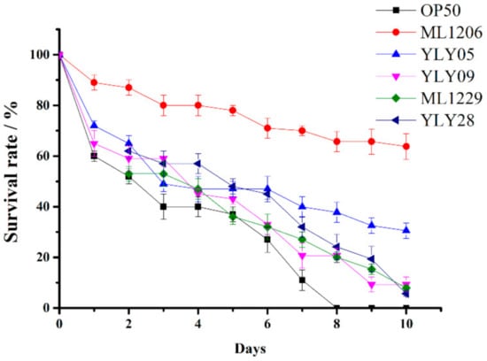 20 marine bacterial strains with no hemolytic activity were assessed for their ability to protect C. elegans from V. anguillarum infection in vivo. Table 1 shows that there was a significant difference in terms of in vivo pathogen-inhibiting ability among these strains. The survival rate of C. elegans varied from 0% to 63.57% on the last day (Day 10). Figure 2 shows the survival curve of C. elegans after being pre-cultured with E. coli OP50 or a selected marine bacterial strain at a concentration of 1.0 × 109 CFU/mL for 24 h then being exposed to V. anguillarum for 10 days. Figure 2 includes the results for E. coli OP50 as the control and five experimental marine bacterial strains (ML1206, YLY05, YLY28, YLY09, and ML1229) with the highest C. elegans survival rate, with strain ML1206 and strain YLY05 having the highest survival rates of 63.57% and 30.75%, respectively. C. elegans in the control group had a 0% survival rate on Day 10 (Figure 2).