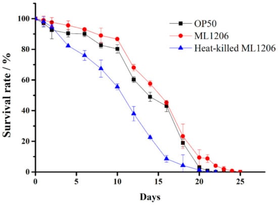 To investigate whether strain ML1206, as a potential probiotic, would have a beneficial effect on maintaining the physiological performance of wild-type C. elegans (N2), the life span of C. elegans was studied. Figure 3 shows that the average life span of the control group fed with E. coli OP50 was 16.74 days, and there was no significant difference between the control group and one of the experimental groups fed with ML1206 that had been pre-treated with heat. However, compared to the control, the average life span of C. elegans was increased by 18.7% (p < 0.05) to 19.87 days for the other experimental group fed with normal ML1206, with the corresponding life curve shifted right. The results suggested that ML1206, as a potential probiotic, could prolong the life span of C. elegans.