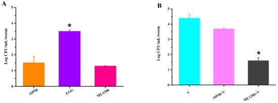 Plate counting of bacterial colonization in the intestine of C. elegans. Note: (A) Bacterial colonization in the intestines of C. elegans fed with E. coli OP50, LGG (Lactobacillus rhamnosus), and ML1206, respectively. (B) V stands for the group of C. elegans that were directly infected with V. anguillarum. OP50 + V and ML1206 + V represent the groups of C. elegans that had been pre-cultured with E. coli OP50 or ML1206 for 24 h first and then infected with V. anguillarum, respectively. Data is presented in the form of mean ± SD of three independent experiments. *: p < 0.05.
