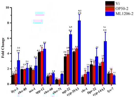 Level of transcription for different defense-related genes. Note: Vi: Group of C. elegans cultured with V. anguillarum; OP50-2: Group of C. elegans pre-cultured with E. coli OP50 for 24 h first, and then infected with V. anguillarum; ML1206-2: Group of C. elegans pre-cultured with P. maritime ML1206 for 24 h first, and then infected with V.anguillarum. The fold change for each gene was calculated with respect to the group of C. elegans cultured with E. coli OP50 (negative control). **: p < 0.05.