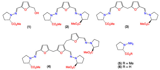 3.1. Origins of Prolinimines 1–4, N-Amino-l-Proline Methyl Ester (5) and Furans 7–8