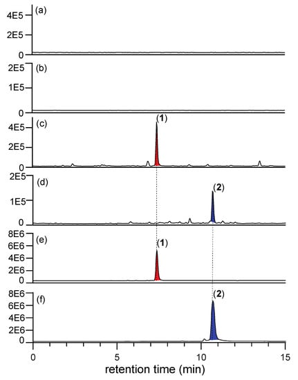 HPLC-ESI-MS-SIE traces of EtOAc extracts from uninoculated (autoclaved) rice grain media (a,b) without, and (c,d) with addition of N-amino-l-proline methyl ester (5), to reveal (a) M + H, m/z 253, 1 not detected, (b) M + H, m/z 377, 2 not detected, (c) M + H, m/z 253, 1 detected, and (d) M + H, m/z 377, 2 detected; with comparison to authentic standards of (e) 1 and (d) 2; confirming that the furans 7 and 8 are present in uninoculated, autoclaved media, and that they react spontaneously with exogenous 5 to form prolinimines 1–2.