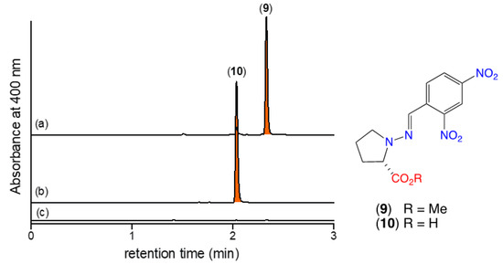 4.5. Detection of N-Aminoprolines 5–6 Using 2,4-Dinitrobenzaldehyde