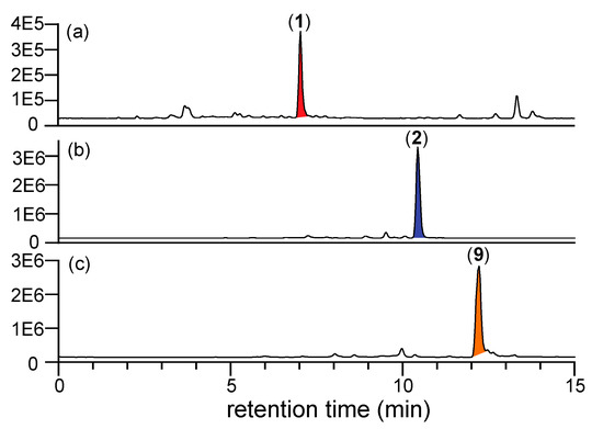 As the N-amino-l-prolines 5 and 6 are polar, water soluble, low molecular weight compounds with negligible UV-vis chromophores, they are particularly difficult to detect in fungal cultivation extracts. To overcome this challenge, we developed a sensitive analytical procedure based on in situ chemical derivatization. Synthetic samples of 5 and 6 in M1 liquid broth media were treated with 2,4-dinitrobenzaldehyde (2,4-DNB), effecting rapid and quantitative in situ transformation to the Schiff bases 9 and 10, respectively. (Note—the need to have a liquid phase necessitated using M1 broth rather than rice grain media). We specifically chose 2,4-DNB as the derivatizing agent due its strong UV chromophore and the presence of the electron withdrawing nitro groups in ortho and para positions, which prime the carbonyl group to nucleophilic attack and enhance imine/hydrazone stability. Importantly, the Schiff bases 9 and 10 proved far more amenable to UHPLC-DAD analysis than underivatized 5 and 6 (Figure 4). These studies confirmed that neither 5 or 6 were present in uninoculated M1 broth, but that if added, their presence could be revealed by in situ derivatization with 2,4-DNB as the Schiff bases 9 and 10.
