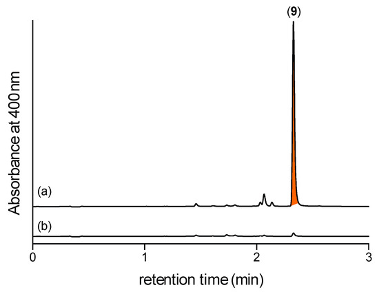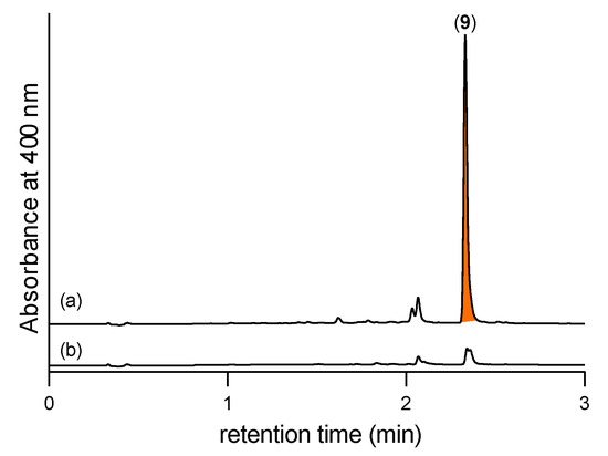 UHPLC-DAD (400 nm) traces of M1 broth media cultivations of CMB-F563 extracted with EtOAc (a) with and (b) without coaddition of 2,4-DNB; confirming that M1 broth media cultivations of CMB-F563 produce 5 (revealed as the Schiff base 9).