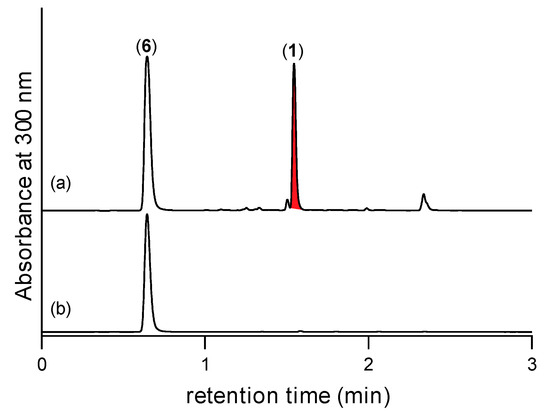UHPLC-DAD (400 nm) traces of M1 broth cultivations of CMB-F563 partitioned into (a) mycelia and (b) supernatant, extracted with EtOAc supplemented with 2,4-DNB confirming that 5 is retained in (i.e., not secreted from) fungal mycelia.