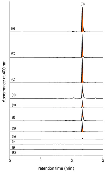 UHPLC-DAD (400 nm) traces of EtOAc (+ 2,4-DNB) extracts prepared from CMB-F563 cultures in (a) PYG, (b) ISP2, (c) TSB (high levels of 9); (d)YES, (e) M1, (f) M2, and (g) PY (significant levels of 9); (h) Czapek, (i) SDB, (j) basal, and (k) PDB (no detectable 9): confirming that CMB-F563 produces the cryptic natural product 5 under a range of different broth media.