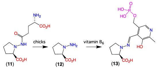 Reports on natural products featuring the N-amino-proline moiety are extremely rare, with the only known example being the flaxseed dipeptide linatine (11) [11,12,13]. Although flaxseed meal is rich in protein, and a potential food source, when ingested by chicks 11 undergoes hydrolysis to N-amino-d-proline (12), which in turn forms an irreversible Schiff base (13) with vitamin B6, leading to a lethal vitamin B6 deficiency syndrome (Figure 10)—rendering flaxseed meal unsuitable for feeding chicks.