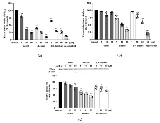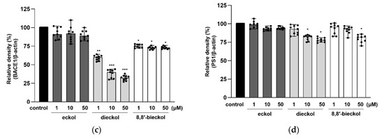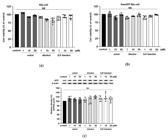 The chemical structures of eckol, dieckol, and 8,8′-bieckol are displayed in Figure 1. Three phlorotannins had no cytotoxic effects at 1, 10, and 50 μM in both N2a and SweAPP N2a cells (Figure 2a,b). In addition, there was no significant change in APP expression levels after the treatment of all the tested compounds (Figure 2c). Therefore, these concentrations were used in the following studies.
