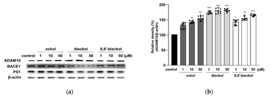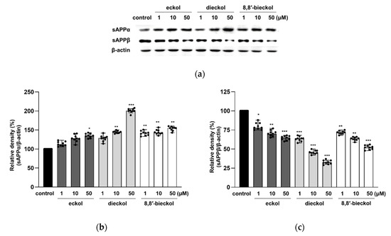 For further investigation into the effects of the tested compounds on the activity of ADAM10 and BACE1, their proteolytic products, including sAPPα and sAPPβ, were measured. Consistent with the results of ADAM10 expression shown in Figure 4a,b, the protein levels of sAPPα were increased after dieckol and 8,8′-bieckol pretreatments (Figure 5). In particular, the expression level of sAPPα was dramatically elevated more than twofold after 50 μM dieckol pretreatment. The expression levels of sAPPβ were significantly reduced with the pre-treatment of all tested compounds.