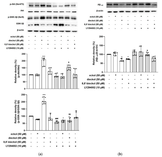 The regulatory effect of phlorotannins on PI3K/Akt/GSK-3β mediated Aβ production in SweAPP N2a cells. (a,b) LY294002 was used as PI3K inhibitor. (a) The expression levels of p-Akt (Ser473) and p-GSK-3β were determined by western blot analysis. The SweAPP N2a cells were pre-incubated with LY294002 for 30 min followed by stimulation with dieckol (50 µM) for 5 h. p-Akt and p-GSK-3β were normalized to total Akt and GSK-3β, respectively. (b) The expression levels of Aβ were determined by western blot analysis. The SweAPP N2a cells were pre-incubated with LY294002 for 30 min followed by stimulation with dieckol (50 µM) for 24 h. β-Actin was used as a normalizing control in the western blot assay. The values are shown as the means ± SD from 3 independent experiments with 3 replications in each experiment. Black dots represent individual data point. *** p < 0.001 and ** p < 0.01 compared with control group; ### p < 0.001 compared with LY294002-untreated control group; ^ p < 0.05 compared with LY294002-untreated eckol group; $ p < 0.05 and $$ p < 0.01 compared with LY294002-untreated dieckol group. +, sample or LY294002 treated; -, sample or LY294002 untreated.