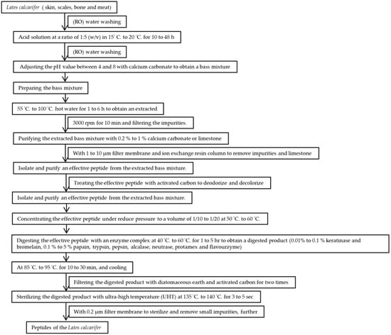 The raw material consisted of sea bass skin, scales, bones, and meat. The raw material was washed 2 to 5 times with reverse osmosis (RO) water to remove blood and impurities, thereby obtaining a prepared bass sample. The control extracts of sea bass were prepared by the hot boiling water. The sea basses were extracted by hot boiling water for 1 to 5 h, and then the extract was lyophilized.