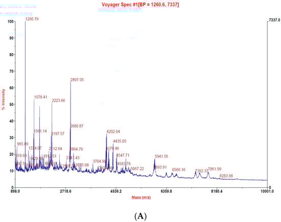 We have followed the patented fermentation process (US patent number: US10,005,823 B2) for the extraction of sea bass peptides (Figure 1). The patented procedure increased the yield of small peptides in comparison to macropeptides. There were 20 small peptides obtained, which were further concentrated, and the molecular weight was found below 5000 mass (m/z) (Figure 2A–C). The increase in small peptide production from sea bass by utilizing the patented process was around 21%, while reduces the macropeptides by 22%. Compared with sea bass soup with macromolecular peptides, LCEP obtained by the patented method was concentrated with more small peptides (Figure 2D). It may be more beneficial for absorption as well as wound healing.