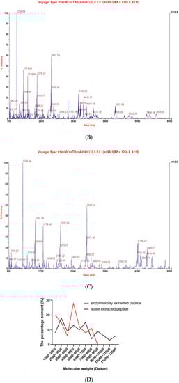 Molecular weight distribution of peptide extract derived from sea bass. LC–MS/MS was used to determine the molecular weight and analysis the molecular weight distribution of sea bass peptide extract. (A) 10,000 mass (m/z), (B) 8500 mass (m/z), (C) 5000 mass (m/z), (D) molecular weight distribution of enzymatically extracted peptide (red line) and nonenzymatically extracted peptide (black line).