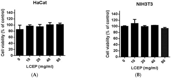 Although extracts from fish are generally safe and acceptable, the toxicity is not well-defined. Therefore, we examined the cytotoxicity of LCEP in the HaCaT cell line, which is an immortal keratinocyte cell derived from human skin that is widely applied in skin research. The MTT assay was conducted for the toxicity assessment of LCEP. As shown in Figure 2, even at high concentrations of LCEP ranging from 10 mg/mL to 80 mg/mL, the extracts did not show any inhibitory effects on cell viability (Figure 3A). Similarly, another assessment using human immortal fibroblast cell line, NIH-3T3 cell, exhibited similar results (Figure 3B) that were consistent with those using the HaCaT cells.