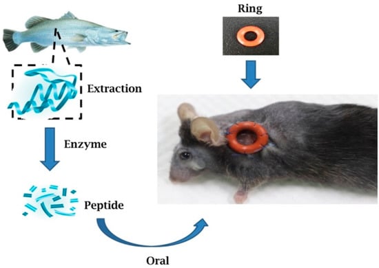 Fisheries byproducts have been used to make highly profitable products for improving human health. It is widely considered that murine organisms serve as a rich source of a variety of essential components along with nutrients, such as collagen, gelatin, polyunsaturated fatty acids (PUFA), vitamins, antioxidants, enzymes, and bioactive peptides that can aid the wound healing process []. Many studies revealed numerous health benefits, food applications, and bioactivities of fish byproducts. For instance, flounder byproducts enhance antioxidant activity, and some collagen and gelatin-related peptides extracted from tilapia assist in wound-healing treatments [,]. With ongoing technological advancements, identification and isolation of the essential components in fish byproducts are accelerated. Numerous fisheries byproducts are being explored for their intrinsic, essential property towards wound healing in recent years []. Further, the components of fish byproducts, such as the ratio of various peptides, collagens and gelatins, are especially abundant and unique [].