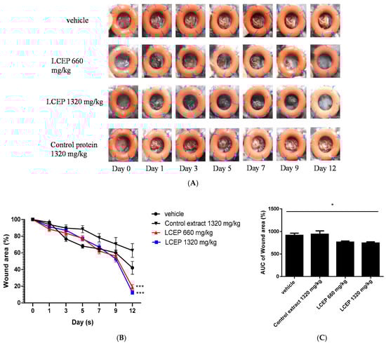 Effects of oral LCEP treatment on wound healing in murine wound model using splint rings. LCEP and control protein were given daily to mice after the surgery for 12 days. Photos of the wounds were taken from day 0 to day 12 (A). The percentage of the wound area was calculated (B). Area under the curve (AUC) of the wound area were calculated (C). Data are means ± standard deviation (SD) (n = 9). The differences between the treatment groups and the vehicle group were analyzed using one-way ANOVA followed by the post hoc Dunnett’s multiple comparisons test. Significant thresholds were set at *** p < 0.001 (B) and * p < 0.05 (C).