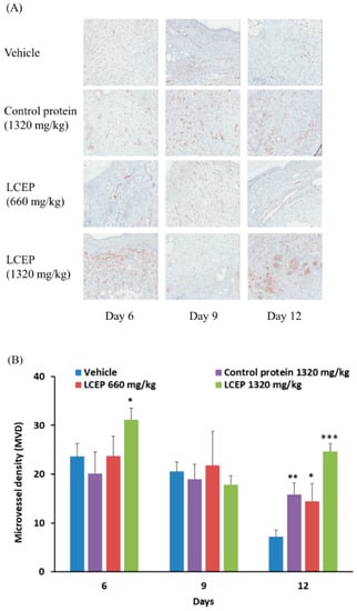 Based on the morphological evaluation of the wound area, oral administration of LCEP improved wound healing and increased granulation tissue generation. The formation of a new microvessel system is important in tissue regeneration and wound healing. It allows the transport of sufficient nutrients through blood vessels and, thus, for the repair of wounds. Therefore, we further investigate the role of angiogenesis in LCEP-improved wound healing in mice. CD31 expression is a dominant indicator for detecting angiogenetic activity and can be used to detect microvessel in tissue []. To investigate the effect of LCEP on the formation of microvessels, CD31 expressions were detected in wound tissue at day 6, day 9 and day 12 (Figure 6A). The quantitative data of microvessel density (MVD) were calculated in CD31 stained tissue. Results showed that LCEP 1320 mg/kg treatment significantly increased the MVD at day 6. On day 12, MVD was significantly higher in control protein, LCEP 660 mg/kg, and LCEP 1320 mg/kg group compared to vehicle group. The high concentration of LCEP shows a more potent effect compared to control protein and low concentration LCEP. Angiogenesis is one of the most important factors for wound healing. Based on our results, it is suggested that oral administration of LCEP effectively enhances wound healing through stimulating angiogenesis at least partially.
