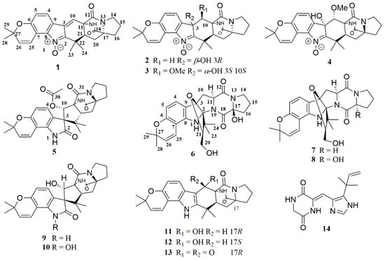 Diketopiperazine alkaloids are valued not only for their properties and functions in fungal self-biology, but also for niche establishment to defend abiotic and biotic stress in nature. They are cyclodipeptides formed by condensation of two amino acids under the control of NRPS genes [], especially those isolated from the genera Aspergillus and Penicillium []. Among them, those derived from tryptophan and proline are the most popular types in the current study, especially in structural diversity, chemical synthesis, and pharmacological activity [,,]. Besides, the substitution of the isopentenyl group enriches the variability of their structures. Prenylated indole alkaloids have been reported to show a wide array of biological activities including antimicrobial, insecticidal, and cytotoxic activities [,]. The fascinating structural and biological properties of prenylated indole alkaloids make it possible for them to be developed into our armor and weaponry: Natural agrochemicals and drugs.