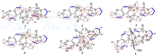 1H-1H COSY (bold blue lines) and key HMBC (red arrows) correlations for 1–6.