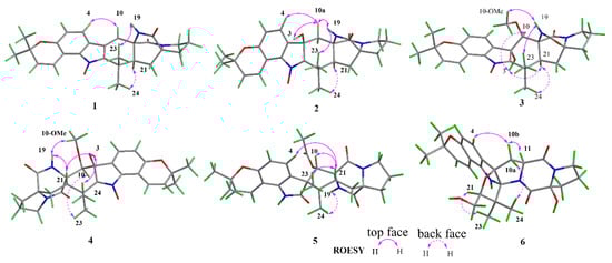 Asperthrin F (6) was isolated as white powders, and the molecular formula was determined as C26H31N3O6 by (+)-HRESIMS [M + Na]+ ion at m/z 504.2103 (calcd. for C26H31N3O6Na, 504.2105) and 13C NMR data, indicating 13 degrees of unsaturation. The 1H NMR, 13C NMR, and HSQC spectra (Table 1, Table 2 and Figures S46–S49) showed four methyl groups, five sp3-methylenes (including one oxygen-bearing methylene), two sp3-methine carbon signals (including one oxygenated carbon), five sp3 non-protonated carbons (including three oxygen-bearing carbons), four olefinic methines, and six sp2 non-protonated carbons. The 1H and 13C NMR data of 6 resembled those of gartryprostatin B [], with the exception that C-17 oxygen-bearing sp3-methine signal (δC 93.6) and C-16 sp3-methylene signal (δH 2.10, 2.33; δC 31.6) had a clear difference. With six degrees of unsaturation accounting for the eight aromatic carbons and two carbonyls, there must be a heptatomic ring system to meet the 13 degrees of unsaturation in 6. The HMBC correlations from H-21 (δH 3.81) to C-2 (δC 98.6), H-23 (δH 1.29) to C-2 (δC 98.6)/C-21 (δC 91.1)/C-24 (δC 18.2) (Figure 2 and Figure S50), and the deshielded shifts of C-3 (δC 97.1)/C-21 (δC 91.1) indicated that the furan ring was formed by an oxygen bridge between C-3 and C-21. Further detailed 1D and 2D NMR spectral analysis revealed that a planar structure of 6 was the same as that of gartryprostatin B. The relative configuration of C-2/C-3/C-21 in the furan ring in 6 was determined by ROESY correlations from H-21 (δH 3.81) to H-23 (δH 1.29), H-10b (δH 2.72) to H-4 (δH 6.97), and H-24 (δH 0.82) to H-10a (δH 2.59). Besides, the ROESY correlation from H-10b (δH 2.72) to H-11 (δH 4.59) determined the relative configurations of C-11. Based on the chemical shift differences of C-17 in 13C NMR data, the relative configurations of C-17 should be opposite to that of gartryprostatin B. The absolute configurations of C-2, C-3, C-11, C-17, and C-21 in 6 were determined as 2S, 3R, 11S, 17S, 21S by the comparison between calculated and experimental ECD spectra (Figure 4D and Figure S53).