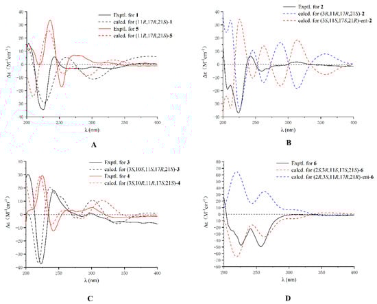 Experimental and calculated ECD spectra for 1–6. (A) for 1 and 5; (B) for 2; (C) for 3 and 4; (D) for 6.