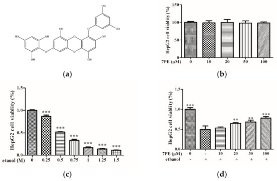 Effect of 7-phloro-eckol (7PE) on cell viability of HepG2/CYP2E1 cells. (a) Chemical structure of 7PE from marine brown alga, Ecklonia cava. Effect of 7PE (0, 10, 20, 50, and 100 µM) on the viability of HepG2/CYP2E1 cells; (b) HepG2/CYP2E1 cells were evaluated by MTT assay, respectively; (c) the viability of various doses of ethanol (0, 0.25, 0.5, 0.75, 1.0, 1.25, and 1.5 M) on HepG2/CYP2E1 cells; (d) protective effects of 7PE (0, 10, 20, 50, and 100 µM) on ethanol-induced (0.5 M) HepG2/CYP2E1 cell injury. Data are shown as mean ± SD (n = 3). * Compared with the control group (ethanol-induced group). ** p < 0.01; *** p < 0.001.