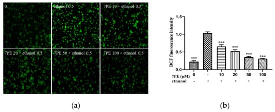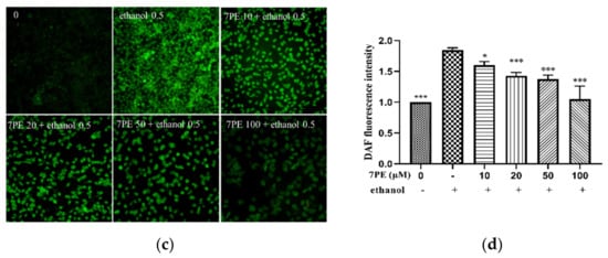 No content was directly proportional to the fluorescence intensity of DAF-FM-DA. Cells were cultured in 24-well plates, and 7PE (0, 1, 10, 20, 50, and 100 µM) was added for 2 h. Cells were treated with 0.5 M ethanol for 24 h in a CO2 incubator. Subsequently, DAF-DA (10 µM) was added for 30 min at 37 °C in the dark. Finally, the fluorescence intensity was examined under an inverted fluorescence microscope (Olympus, Tokyo, Japan).