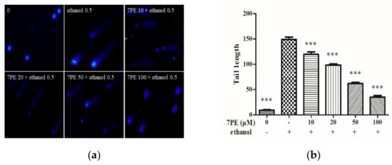 HepG2/CYP2E1 cells were treated with 7PE (0, 10, 20, 50, and 100 µM) and 0.5 M ethanol for 24 h in a CO2 incubator. Subsequently, the cells were treated with EDTA-trypsin to form a cell suspension (1 × 105 cells/mL). The cell suspension (20 μL) and 1% low-melting-point agarose (LMA, 80 μL) were mixed and dropped onto 0.8% normal-melting-point agarose (NMA, 100 μL). After the gel was cured, the slides were immersed in a precooled lysate solution (2.5 M NaCl, 200 mM NaOH, 100 mM Na2EDTA, 10 mM Tris, 1%Triton X-100, and 1% sodium lauroyl sarcosinate; pH 10) at 4 °C for 90 min. The slides were then gently immersed in an alkaline electrophoresis solution (200 mM NaOH and 1 mM Na2EDTA; pH > 13) at 4 °C for 30 min. Next, electrophoresis (25 V; 20 min) was performed, and the slides were stained with DAPI (20 μg/mL; 20 μL) in the dark for 10 min. Finally, the fluorescence intensity was observed under an inverted fluorescence microscope (Olympus, Tokyo, Japan), and the CASP software was applied to analyzed comet images.