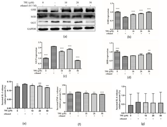 Effect of 7PE on superoxide dismutase (SOD), glutathione (GSH), and γ-glutamyl transferase (GGT) protein levels by Western blot and detection of related inflammatory factors by ELISA in HepG2 cells. Cells were treated with 7PE (10, 20, and 50 μM) for 2 h and then treated with 0.5 M ethanol for 24 h. GAPDH was used as an internal control. (a) Protein expression (relative to GAPDH) was evaluated; (b) GSH protein expression was evaluated; (c) GGT protein expression was evaluated; (d) SOD protein expression was evaluated; (e) interleukin-1 (IL-1) expression was evaluated; (f) tumor necrosis factor-α (TNF-α) expression was evaluated; (g) IL-6 expression was evaluated. Data are shown as mean ± SD (n = 3). * Compared with the control group (ethanol-induced group). * p < 0.05; ** p < 0.01; *** p < 0.001.