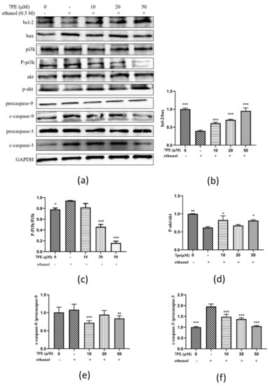 In order to determine whether 7PE has an anti-apoptotic effect on alcohol-induced cytotoxicity in HepG2/CYP2E1 cells, the expressions of Bcl-2 and Bax were determined (Figure 5). In comparison with the blank group, the expression of the bcl-2 protein decreased, and the expression of bax protein increased in the control group. Compared with the control group, after 7PE treatment, the expression of bcl-2 increased while the expression of bax decreased in a dose-dependent manner. Additionally, compared with the blank group, the p-pi3k protein, cleaved caspase-9 (c-c-9) protein, and cleaved caspase-3 (c-c-3) protein in the control group increased, while p-akt decreased (Figure 5c–f). These results indicate that 7PE could alleviate the oxidative stress induced by ethanol by regulating the production of apoptosis-related proteins.