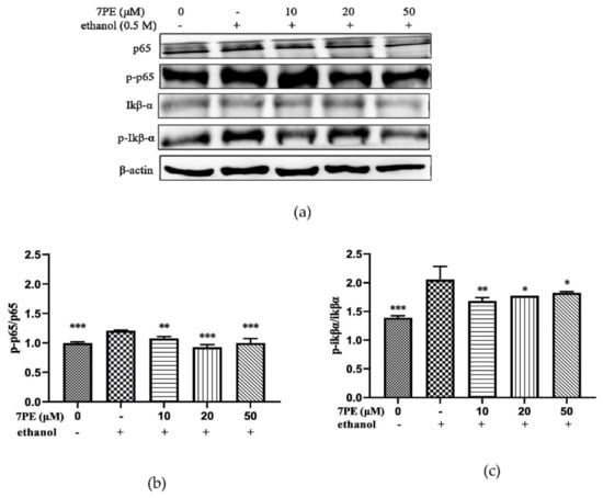 (a) The phosphorylation levels of p65, p-p65, IκBα, and p-IκBα proteins in HepG2/CYP2E1 cells. Cells were treated with 7PE (10, 20, and 50 μM) for 2 h, then treated with 0.5 M ethanol for 24 h; (b) the ratios of p-p65/p65 were calculated; (c) the ratios of p-IκBα/IκBα were calculated. Data are shown as mean ± SD (n = 3). * Compared with the control group (ethanol-induced group). * p < 0.05; ** p < 0.01; *** p < 0.001.