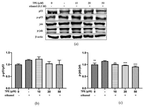 (a) The phosphorylation levels of p53, p-p53, JNK, and p-JNK proteins in HepG2/CYP2E1 cells. Cells were treated with 7PE (10, 20, and 50μM) for 2 h and then treated with 0.5 M ethanol for 24 h; (b) the ratios of p-p53/p53 were calculated; (c) the ratios of p-JNK/JNK were calculated. Data are shown as mean ± SD (n = 3). * Compared with the control group (ethanol-induced group). ** p < 0.01, *** p < 0.001.