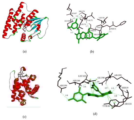 (a,c) 3D model of the interaction between 7PE and GSH and between 7PE and bcl-2, respectively. (b,d) 3D model of the optimal docking structure interaction between 7PE and the active sites of GSH and bcl-2, respectively.
