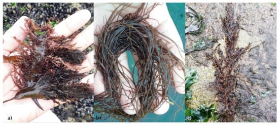Three seaweeds studied at the collection site (Figueira da Foz, Portugal): (a) Calliblepharis jubata (Rhodophyta—carrageenan-bearing); (b) Gracilaria gracilis (Rhodophyta—agar bearing); (c) Sargassum muticum (Phaeophyta—alginate-bearing).