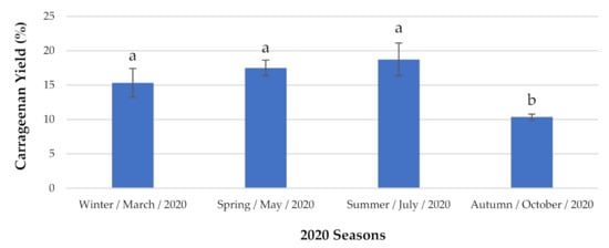 Carrageenan content analyzed seasonally. The extraction yields are expressed as mean ± standard deviation (n = 3). a,b The same letters indicate no significant differences at the p-value < 0.05 level.
