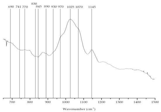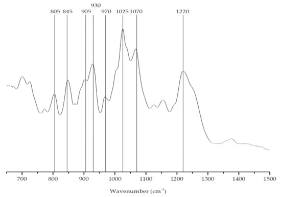 The FTIR-ATR spectrum (Figure 3) of the phycocolloids extracted from C. jubata showed bands at approximately 930 and 845 cm−1. However, an additional well-defined feature was visible at around 805 cm−1, indicating the presence of two sulfate ester groups on the anhydro-d-galactose residues, a characteristic band of the iota-carrageenan (Table 1) [,].
