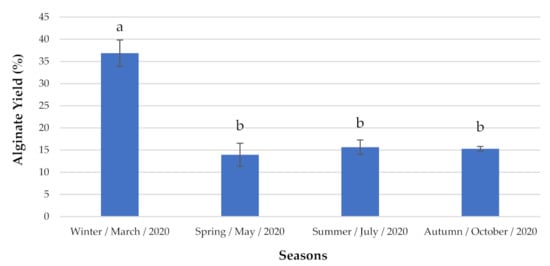 Alginate content analyzed seasonally. The extraction yields are expressed as mean ± standard deviation (n = 3). a,b Similar letters indicate no significant differences at the p-value < 0.05 level.