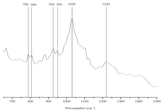 The main polysaccharide found in the brown alga (S. muticum) was alginic acid, a linear copolymer of mannuronic (M) and guluronic acid (G). Different types of alginic acid present different proportions and/or alternating patterns of different guluronic (G) and mannuronic (M) units. The presence of these acids can be identified from their characteristic bands in the vibrational spectrum (Figure 7). The extracted colloid showed two characteristic bands: 806 cm−1, assigned to M units, and 788 cm−1, assigned to G units, suggesting the presence of similar amounts of mannuronate and guluronate residues (Table 3) [,].